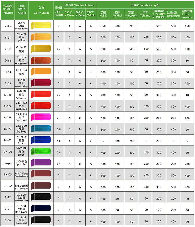 本产品为油性产品,是经过多次改良环保型 1:2 金属络合染料。本系列产品有相似的染色特性,可互相配色,PH 值为中性,着色强度高,均染性良好,有极高的日晒牢度,我们采用环保溶剂,产品稳定性好,颜色透明鲜艳和一般产品对比颜色鲜艳度和精细度有明显的超越。