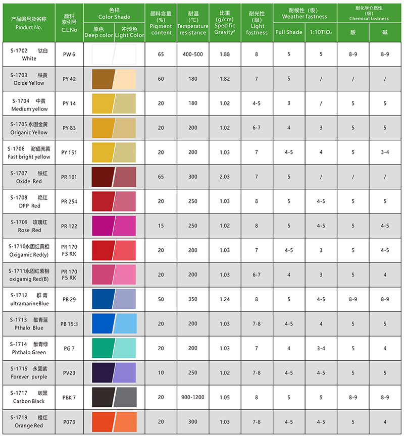 不含苯类溶剂,不含多环芳香烃,不含邻苯二甲酸盐。更环保,更通用,高性能,高固含低粘度,易分散,水油无树脂通用色浆还具有较好的贮存稳定性和优异的调入性,可以适用于不同的溶剂型树脂和水溶性树脂体系中。它能把色浆对涂料体系性能的影响降到最低,例如耐水性,附着力,相溶性等,有效的减少色浆的品种和库存。